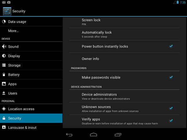 Чтобы решить эту проблему, нажмите настройки и это должно привести вас к безопасность экран. Нажмите на неизвестные источники поле, чтобы включить его. Теперь нажмите кнопку «Назад» и попробуйте установить снова.